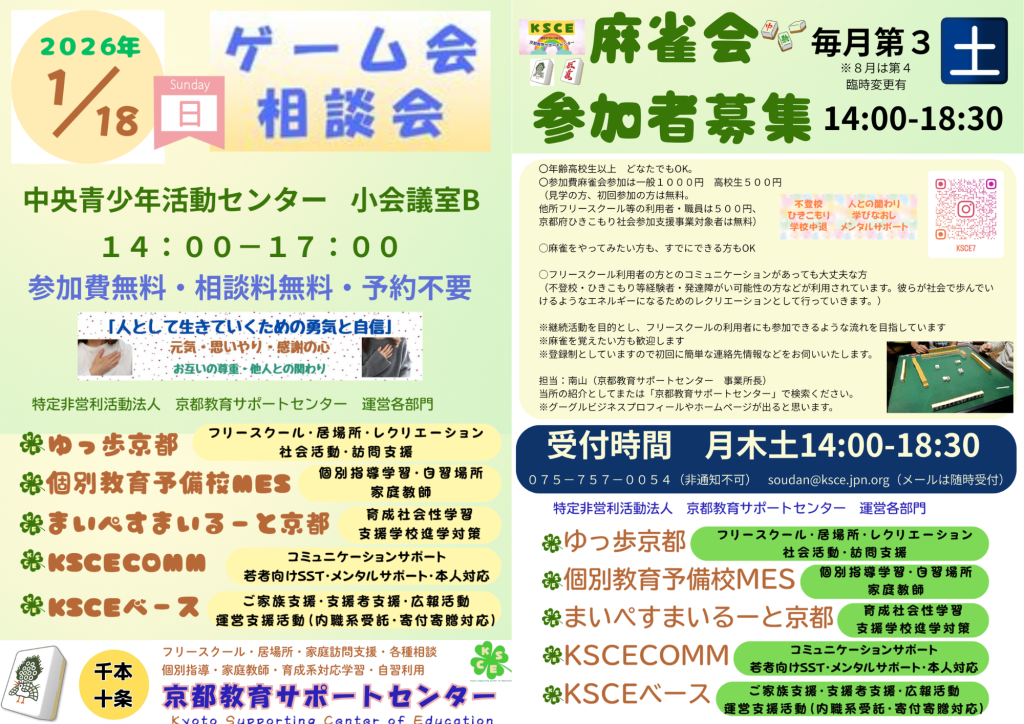 ●月に1-3回ほど出張版で中央青少年活動センター・南青少年活動センター・下京青少年活動センターを使用してレク日・休業日居場所を実施しています。1月18日日曜日中央青少年活動センター小会議室Bにてゲーム会相談会を実施します。無料です。お気軽にお越しください。