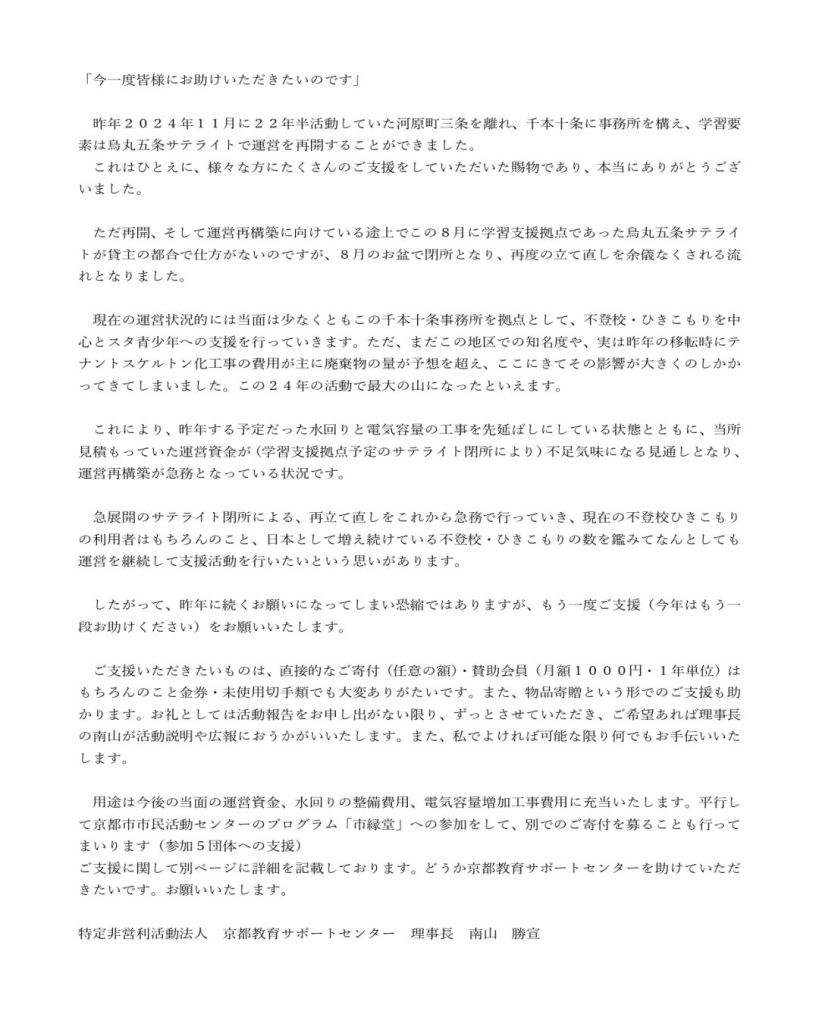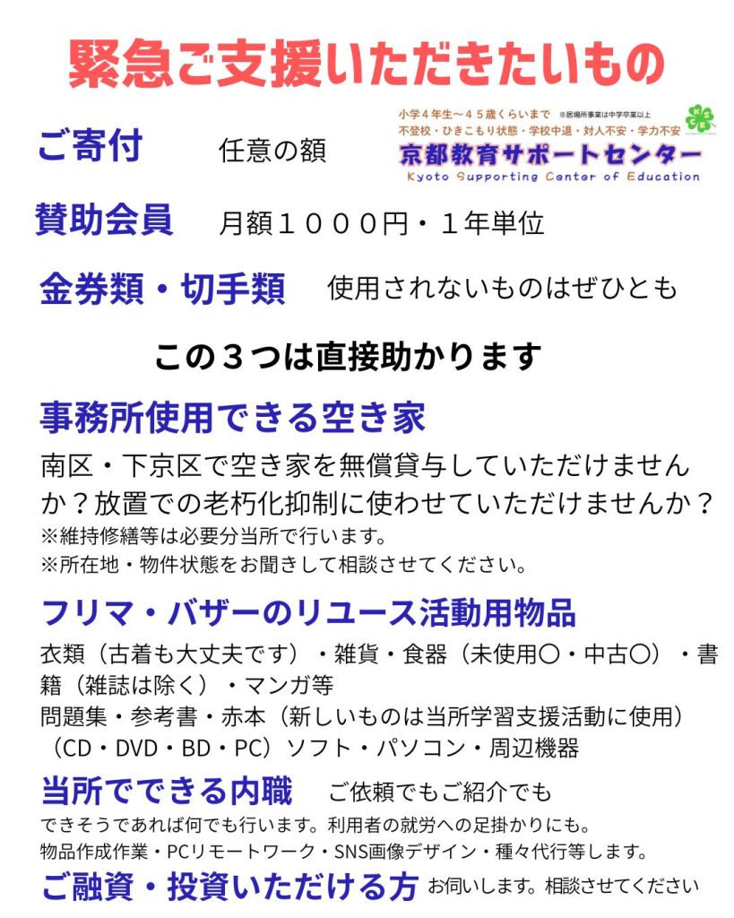 ご支援に関して別ページに詳細を記載しております。どうか京都教育サポートセンターを助けていただきたいです。お願いいたします。